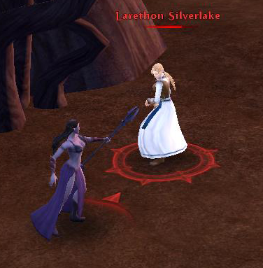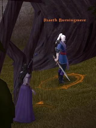 5: Wandering on the edge of the forest as you come out is Ilsaeth Burningmere. Even though he is a fellow dark elf and marked as such, attack him and kill him swiftly. Don't let the guards help or you might not get recognition for the kill.