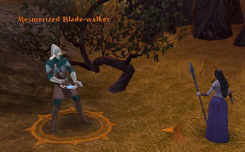 11: Deeper into the forest you will find a Blade-walker. Open your quest inventory and use the Phaos Gem on one of them to mesmerize them. Hurry north-west out of the forest back to the slave pens for a quest turn in.
