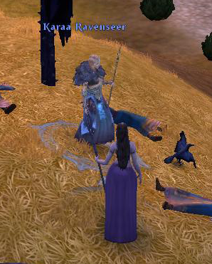 Turn in his Kill Quest – it gives 82 xp per kill you have made, not bad! Head south towards the camp, but veer to the left and go up the small hill with the tree just before you get there. Here you should find Karaa Ravenseer who gives you the quest Birds of a Feather and a quest item Ravenseer's Mark.